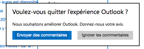 Ensuite, vous devriez voir une boîte de dialogue vous demandant un feedback de la conception d’Outlook. Vous pouvez décrire la raison de votre départ d’Outlook ou de simplement cliquer sur le bouton “Ignorer les commentaires” pour continuer.