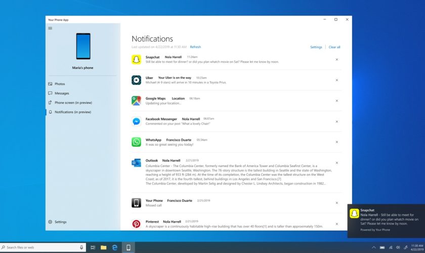 Malgré son nom plutôt étrange, l’application Your Phone est le pont presque littéral de Microsoft entre son système d’exploitation Windows 10 et votre smartphone, que ce soit un dispositif Android ou iOS. Au départ, il s’agissait simplement d’un moyen de voir les notifications du smartphone sur votre PC, mais l’application a fini par acquérir des fonctionnalités qui vont bien au-delà, comme celle de répondre aux messages directement depuis le bureau.