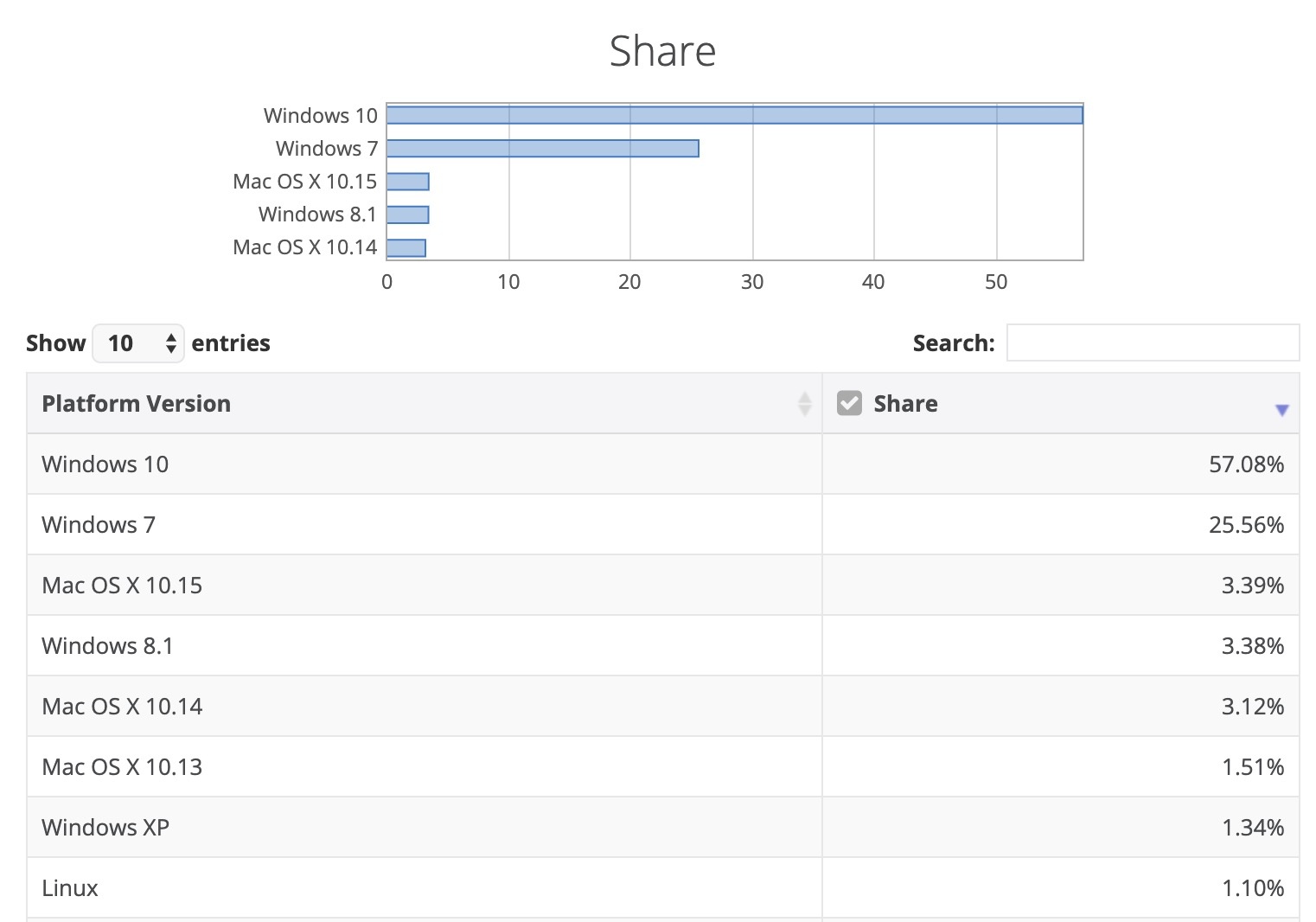 La différence entre Windows 10 et le reste des systèmes d’exploitation en termes de part de marché est énorme. Alors que Windows 7 est le deuxième des charts, le troisième dans la liste est Windows 8.1, qui alimente actuellement 3,38 % des appareils. macOS 10.14 est le suivant avec 3,20 %, suivi par la version 10.15 avec 4,12 %. Windows XP continue d’être dans le classement avec une part de marché de 1,49 %.