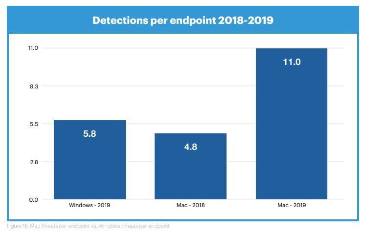 Selon leur analyse, qui est uniquement basée sur les données des clients de Malwarebytes, les utilisateurs de Mac ont été ciblés par 11 menaces l’année dernière. Dans le cas de Windows, seulement 5,8 menaces ont été détectées en 2019.