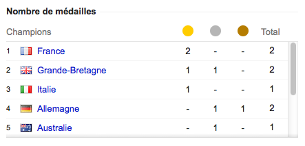 Lors des JO 2012, les compétitions de canoë et kayak se sont déroulées du 29 juillet au 2 août. Et à ce petit jeu, c’est la France qui est en tête puisque nous récupérons une médaille d’Or par le biais de Tony Estanguet lors de la finale homme du canoë monoplace (C1), mais également une médaille d’Or grâce à Émilie Fer en finale du kayak (K1) femmes ! Derrière nous suivent la Grande-Bretagne et l’Italie. Voici le tableau des médailles pour cette compétition :