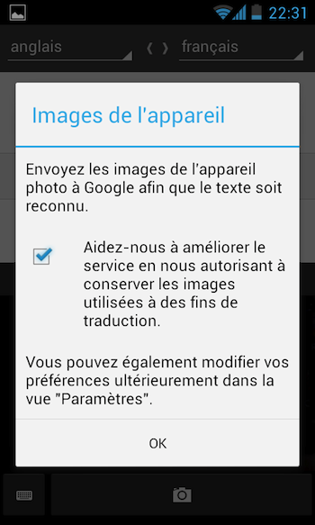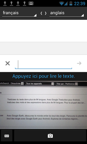 - Prenez une photo, puis balayez le texte pour le traduire (fonctionnalité disponible sur Android 2.3 ou version ultérieure)