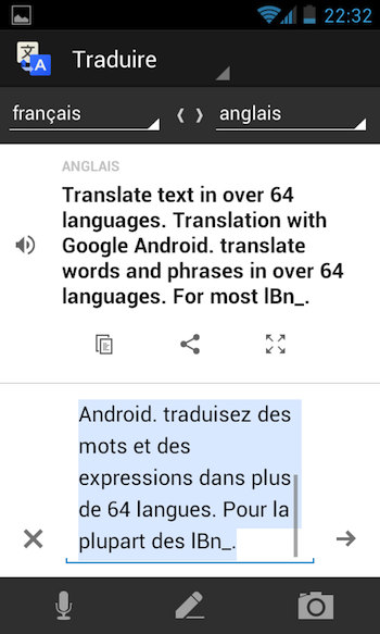 L’application permet aux utilisateurs de traduire un texte dans plus de 64 langues : afrikaans, albanais, allemand, anglais, arabe, arménien, azéri, basque, bengali, biélorusse, bulgare, catalan, chinois (simplifié), chinois (traditionnel), coréen, créole haïtien, croate, danois, espagnol, espéranto, estonien, finnois, français, galicien, gallois, géorgien, grec, gujarati, hébreu, hindi, hongrois, indonésien, irlandais, islandais, italien, japonais, kannada, latin, letton, lituanien, macédonien, malaisien, maltais, néerlandais, norvégien, persan, polonais, portugais, roumain, russe, serbe, slovaque, slovène, suédois, swahili, tagalog, tamul, tchèque, telugu, thaï, turc, ukrainien, urdu, vietnamien, yiddish. Vous en voulez plus ? 🙂