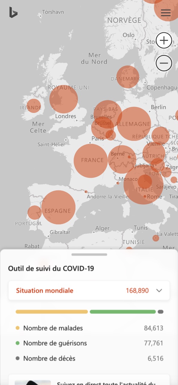 Microsoft a publié un outil de suivi gratuit du COVID-19, alias coronavirus, pour les ordinateurs de bureau et les smartphones sur le moteur de recherche Bing, avec les informations essentielles sur le nombre de cas affichés dans une interface utilisateur très graphique.