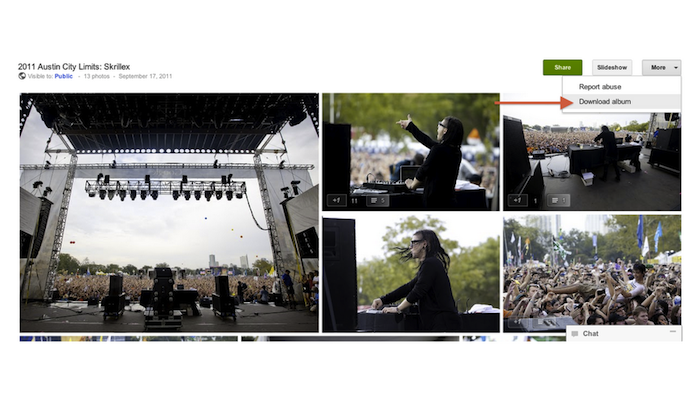 De plus, comme indiqué ci-dessus, vous allez également avoir la possibilité de télécharger des albums complets. Sur une page de l’album, cliquez sur “Plus” puis “Télécharger l’album” pour récupérer un fichier Zip contenant les photos dans l’album (Exemple : http://goo.gl/EvfFH).