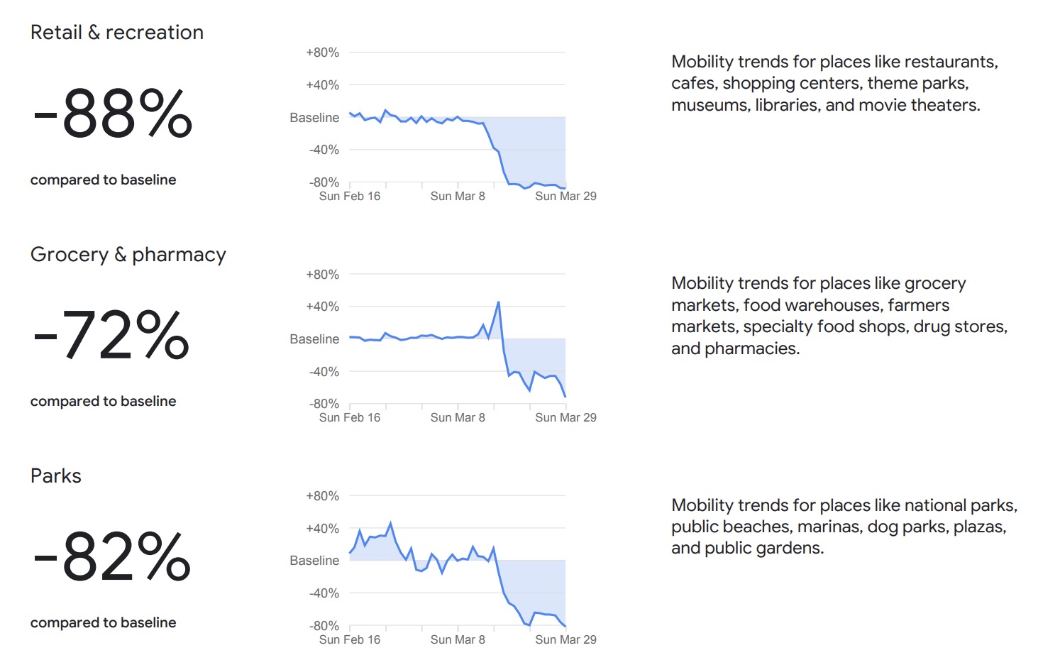 Le nombre de visites dans les épiceries et les pharmacies a baissé de 72 % en France. Les lieux de transport en commun ont également connu une baisse importante de la fréquentation dans tous ces pays. Les visites dans les parcs et les pharmacies ont également chuté de manière drastique, mais les chiffres varient en fonction de la gravité de la crise dans le pays.