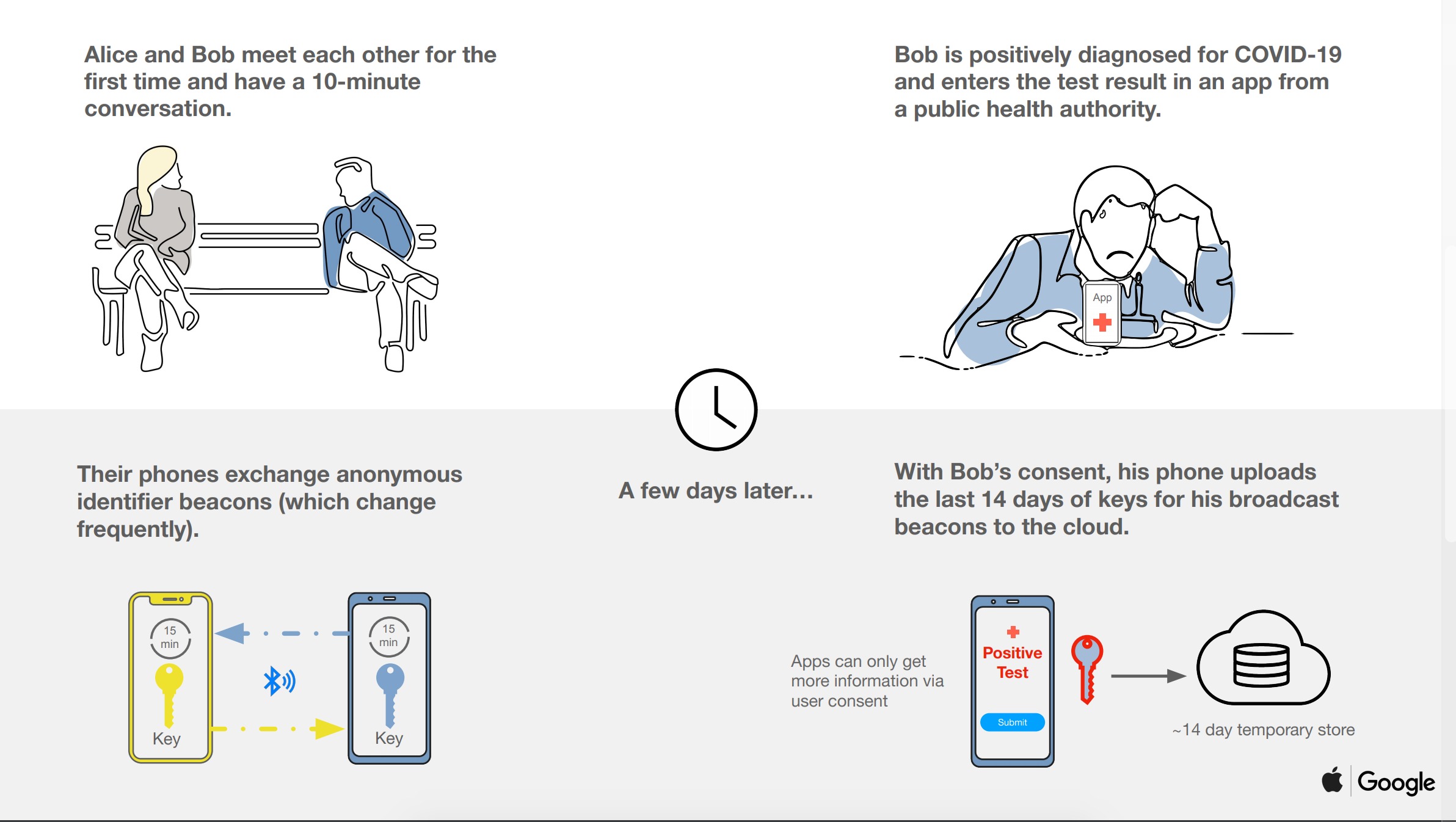 En revanche, si un utilisateur est déclaré comme ayant le coronavirus COVID-19, les codes d’identification que son smartphone a utilisés au cours des quatorze derniers jours seront, avec son consentement, téléchargés vers un serveur central. Les appareils des autres utilisateurs vérifieront si l’un de ces codes existe dans la mémoire de leur smartphone et, si c’est le cas, l’utilisateur sera averti de son exposition potentielle. Tout ce rapprochement s’effectue sur les appareils des utilisateurs : aucun enregistrement de deux utilisateurs se trouvant à proximité n’est jamais mis en ligne ou rendu public.