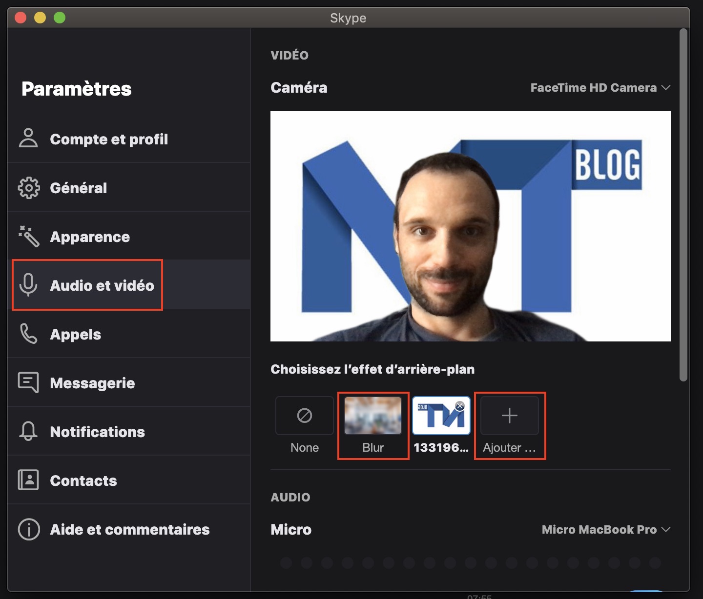 Choisissez l’onglet « Audio & Vidéo ». Dans ce menu, vous pouvez sélectionner « Blur » pour flouter tous les appels ou cliquez sur « Ajouter » pour créer un arrière-plan personnalisé à partir d’un fichier image sur votre disque dur local. Vous pouvez également sélectionner un arrière-plan personnalisé existant que vous avez déjà téléchargé.