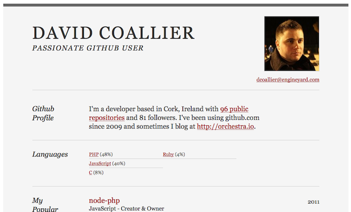 Comme le mentionne le créateur du service, David Coallier, My Github Résumé permet de générer automatiquement un résumé du profil GitHub de qui que ce soit. Voici un exemple de David : (le mien étant moins fourni ;))
