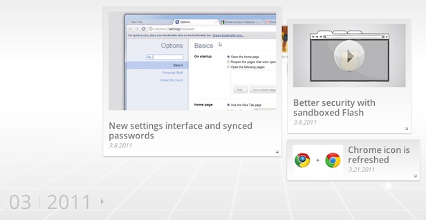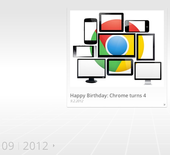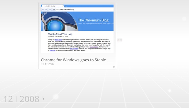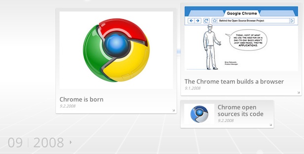 Google célèbre le 4ème anniversaire de son navigateur, Chrome, avec le lancement de la Chrome Time Machine, un site interactif qui vous emmène à travers l’évolution du navigateur, de son lancement jusqu’à aujourd’hui. Rétrospectivement il n’a jamais connu de coup dur…