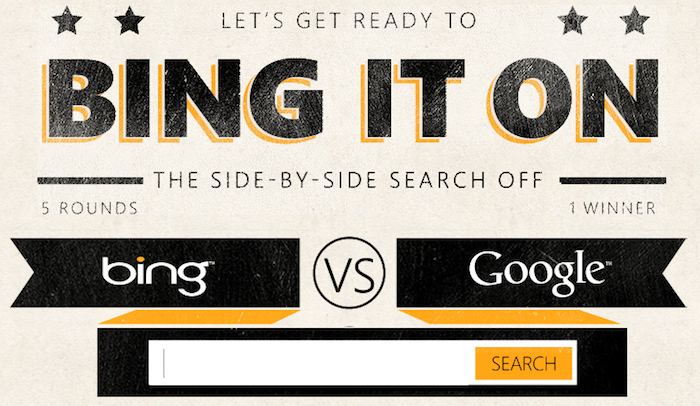 Ainsi, à partir d’aujourd’hui vous pouvez cliquer et choisir les résultats de recherche Web que vous préférez en participant au défi nommé Bing It On, accessible via BingItOn.com. Après avoir effectué la recherche par un mot clé, les gens vont indiquer leur préférence quant-aux résultats de recherche affichés. Par ce biais, Microsoft souhaite montrer que la qualité des résultats de recherche de Bing a dépassé celle de Google !