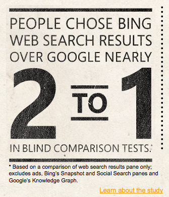 Un porte-parole de Bing a indiqué dans une publication que si la plupart des gens s’identifient comme des utilisateurs de Google, une étude indépendante commandée par Microsoft Corp montre que deux personnes contre une ont choisi les résultats de recherche de Bing par rapport à ceux proposés par Google dans des tests de comparaison aveugles. Compte tenu de ces résultats, Bing a décidé qu’il était temps de laisser aux gens la possibilité de voir par eux-mêmes qu’il y a une meilleure option à la recherche.