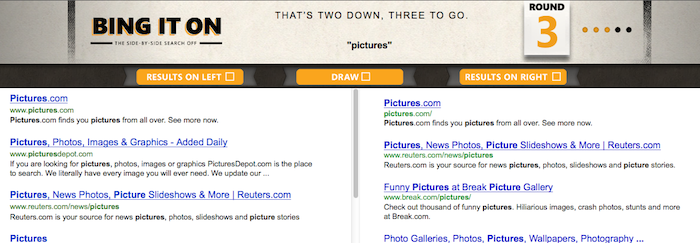 Le défi se déroule en cinq rounds. Dans chacun d’eux, vous devez taper un mot-clé, en anglais pour que la recherche soit pertinente, puis tout ce que vous avez à faire est de constater la qualité des résultats à gauche et à droite et d’indiquer le “vainqueur” à l’aide des deux boutons en haut de la page Web. Si vous estimez que les résultats sont équivalents, le bouton “Draw” est fait pour vous.