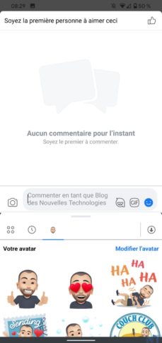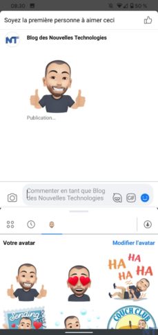 Et c’est tout ! Vous pouvez utiliser votre avatar Facebook comme photo de profil, le partager dans votre fil d’actualité ou l’utiliser pour commenter les messages d’autres personnes. Pour ce faire, cliquez sur le smiley à côté de l’icône GIF, puis l’icône de l’avatar. Vous pouvez alors choisir l’autocollant parfait pour votre avatar.