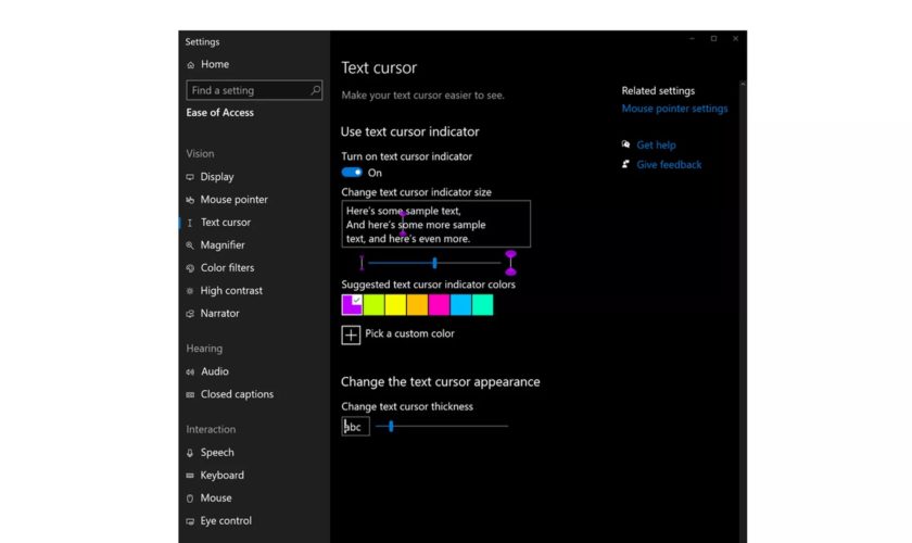 Si les utilisateurs peuvent modifier l’aspect des polices et même du curseur de la souris, il n’est pas aussi facile de savoir où se trouve le curseur du texte. Désormais, ils peuvent modifier non seulement l’épaisseur de ce curseur du texte, mais aussi les couleurs de l’indicateur du curseur pour une meilleure visibilité.