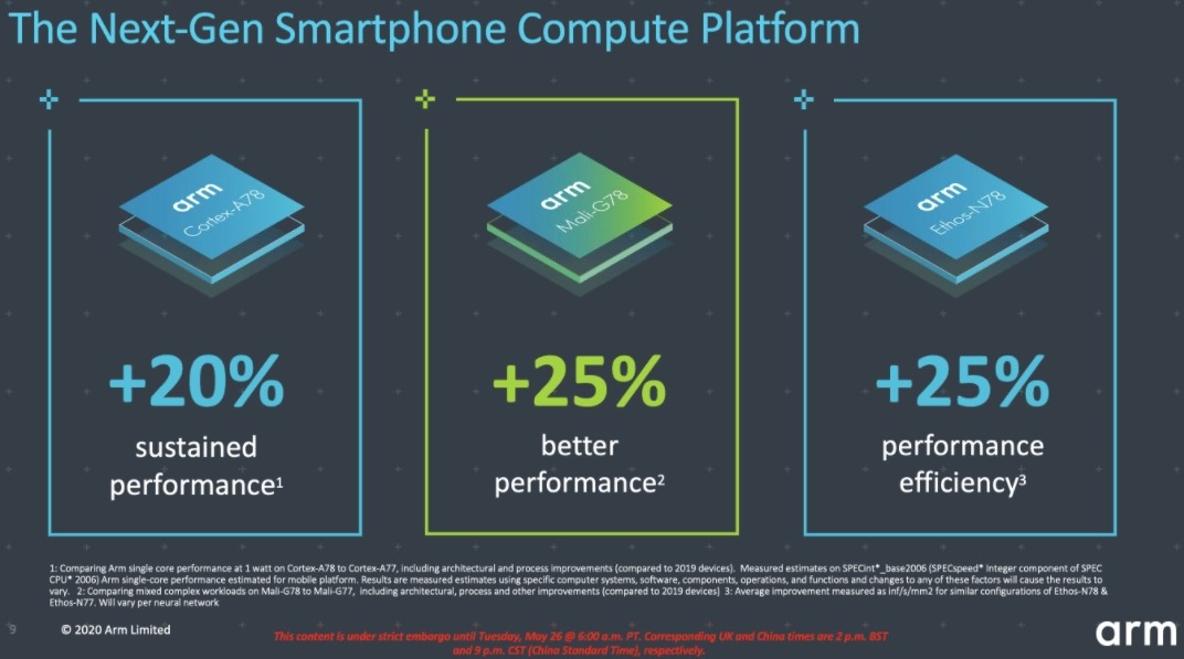 La conception du cœur du processeur Cortex-A78 est « sans aucun doute notre processeur Cortex-A le plus efficace jamais conçu pour les mobiles », selon ARM. Il présente une augmentation de 20 % des « performances soutenues » par rapport à la conception du Cortex-A77 de l’année dernière.