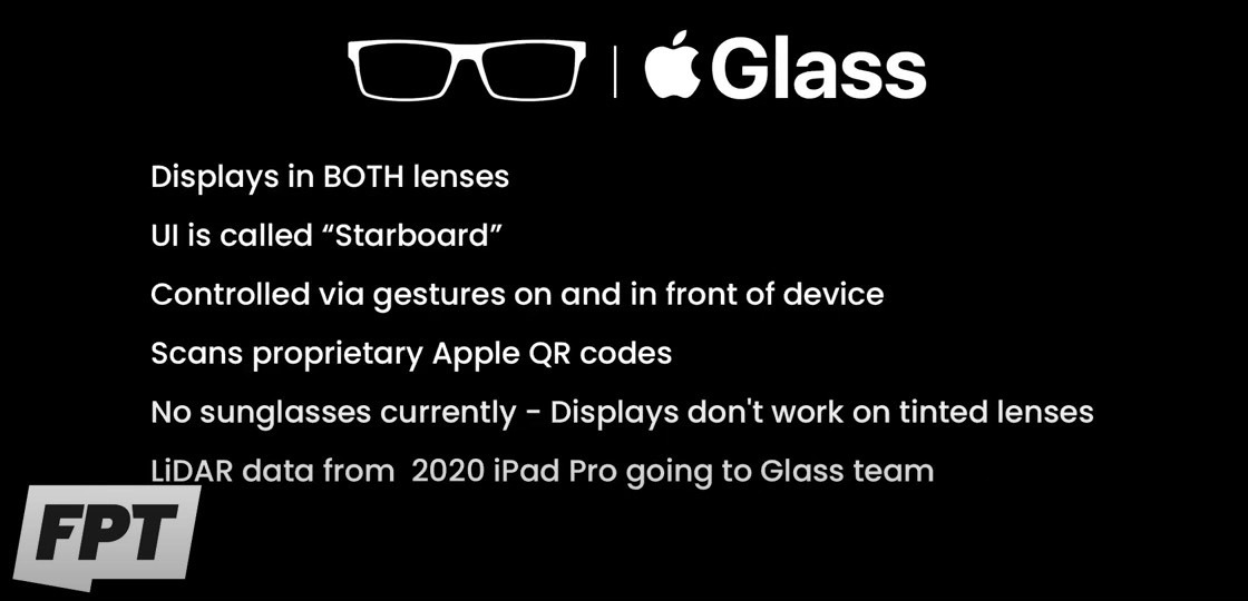 L’interface utilisateur des Apple Glass s’appelle Starboard, ce que Prosser a révélé il y a quelques semaines lors d’un podcast. L’utilisateur pourra contrôler les Apple Glass par des gestes sur l’appareil et devant celui-ci. L’iPhone traitera les données qui seront projetées sur les lunettes, car la paire de lunettes sera très analogue à la Apple Watch originale en ce qui concerne les applications. Les lunettes AR seront également capables de lire des QR codes spéciaux fabriqués par Apple.