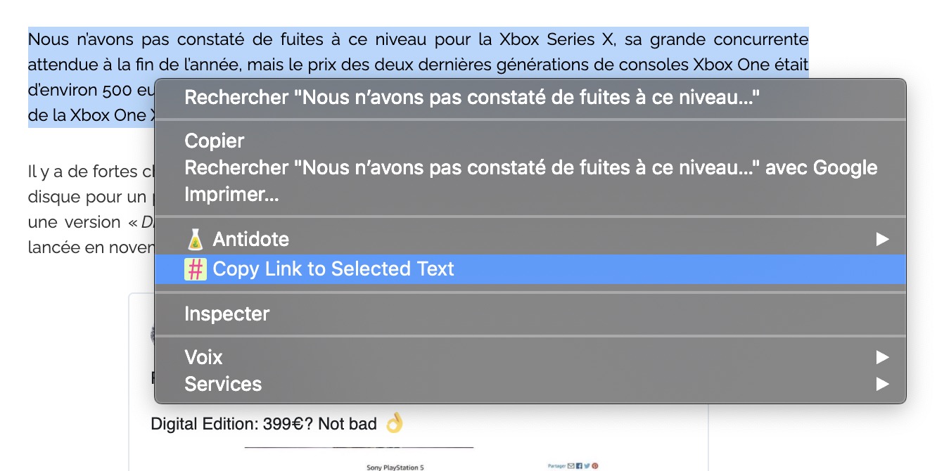 Alors qu’il était déjà possible de composer ces liens fragmentés en ajoutant le texte en question à la fin d’une URL normale, Link to Text Fragment vous épargne un travail manuel et vous permet de les générer en un clic.
