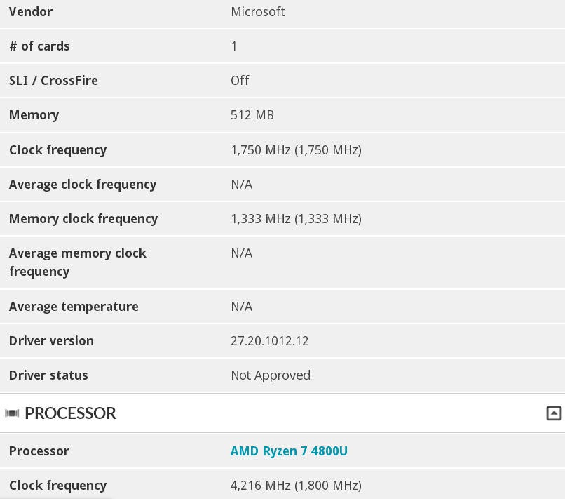 Comme le montre la capture d’écran ci-dessous, le processeur de l’appareil non identifié semble être cadencé à 4,21 GHz. Le processeur Ryzen 7 4800U est un processeur à octa-core avec 16 threads. Il s’agit d’une puce de 7 nm qui offre des vitesses d’horloge comprises entre 1,8 GHz et 4,2 GHz. Le processeur est spécialement conçu pour les ultra-portables et autres appareils légers similaires et a un TDP de 15 W. Il est également doté d’une gestion thermique améliorée pour une meilleure efficacité.