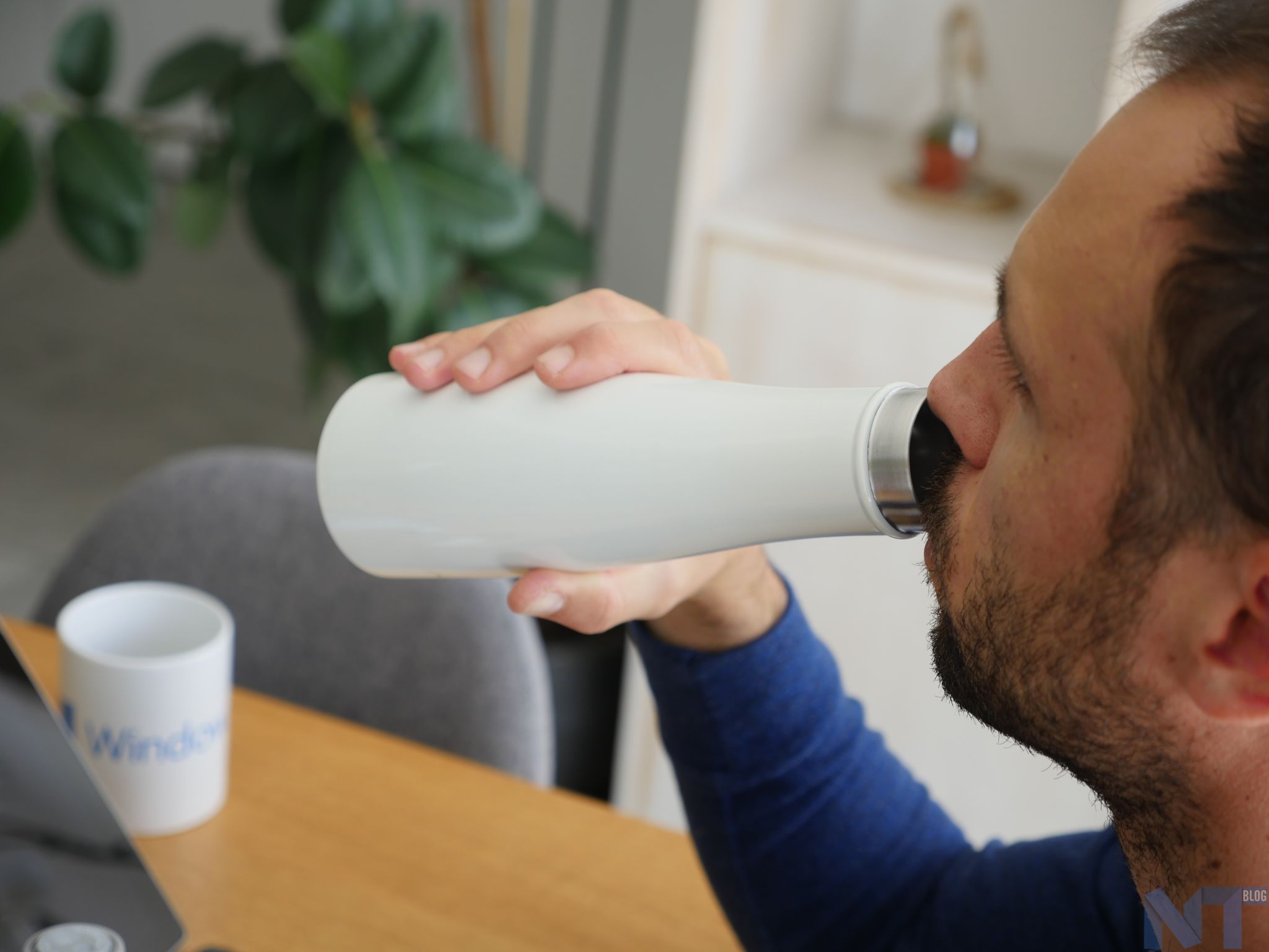 Quant à l’autonomie, la Noerden LIZ est évaluée à un mois (avec une stérilisation aux UV par jour) — un constat que je n’ai pas encore fait puisque cela fait que 3 semaines que je l’utilise tous les jours. Mais jusqu’à présent, la bouteille n’a pas besoin d’être rechargée (quand la batterie est faible, la LED clignote en rouge).