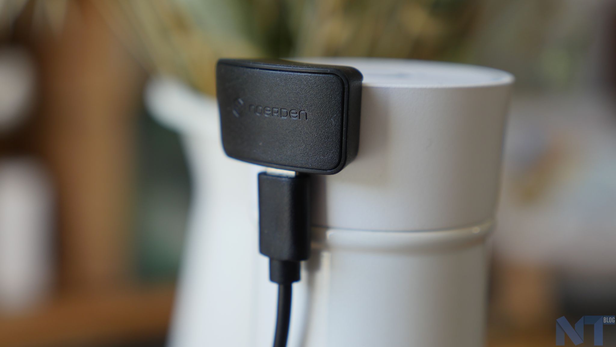Le plus évident reste les deux connecteurs sur le bouchon qui sont magnétiques. Ceux-ci vous permettent de clipser facilement le câble USB que vous pouvez trouver dans l’emballage. C’est un concept intéressant si l’on considère que l’un des points de défaillance des bouteilles intelligentes se situe généralement autour du port et qu’une pièce magnétique propriétaire à laquelle vous pouvez connecter n’importe quel câble micro USB pourrait promettre une plus grande longévité à l’appareil. En d’autres termes, à moins de perdre la pièce magnétique où que celle-ci venait à être défaillante et que vous ne puissiez pas la remplacer, cela reste une option alléchante.