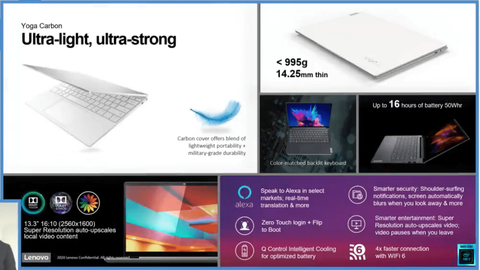 En d’autres termes, il y a de fortes chances que nous ayons l’un des premiers ordinateurs portables haut de gamme minces et légers de Lenovo, équipé d’un processeur Intel Tiger Lake et de graphiques Intel Xe. Bien qu’il n’y ait pas de mots sur le prix ou la date de sortie, un ensemble de diapositives de présentation postées sur Twitter par WalkingCat donne une image de la fiche technique du portable Yoga Carbon.