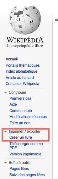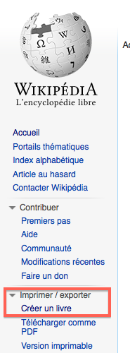 Vous avez envie de créer votre propre ebook personnel ? Commencez par cliquer sur le lien “Créer un ebook” situé dans la barre latérale de gauche de Wikipédia sous la section “Imprimer / exporter”. De là, vous pouvez compiler des articles (ou des catégories complètes) dans une collection personnelle, et ensuite les exporter.