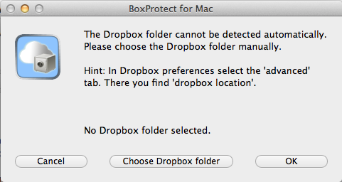 Une fois que vous exécutez le fichier dmg et ouvrez BoxProtect pour la première fois, il va tenter de détecter automatiquement l’endroit où votre dossier Dropbox est situé. Si l’applicatif ne le trouve pas, vous devez le sélectionner manuellement.