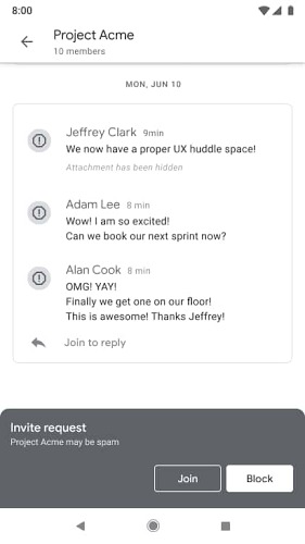 Google introduit dans Chat des protections contre le phishing de type Gmail. Dans le cadre de ce plan, tous les liens envoyés par Google Chat seront vérifiés en temps réel à l’aide des données de Safe Browsing. Tout lien malveillant détecté par ces contrôles sera signalé comme tel. Dans les semaines à venir, les utilisateurs pourront signaler et bloquer les salles de chat s’ils suspectent une activité malveillante.
