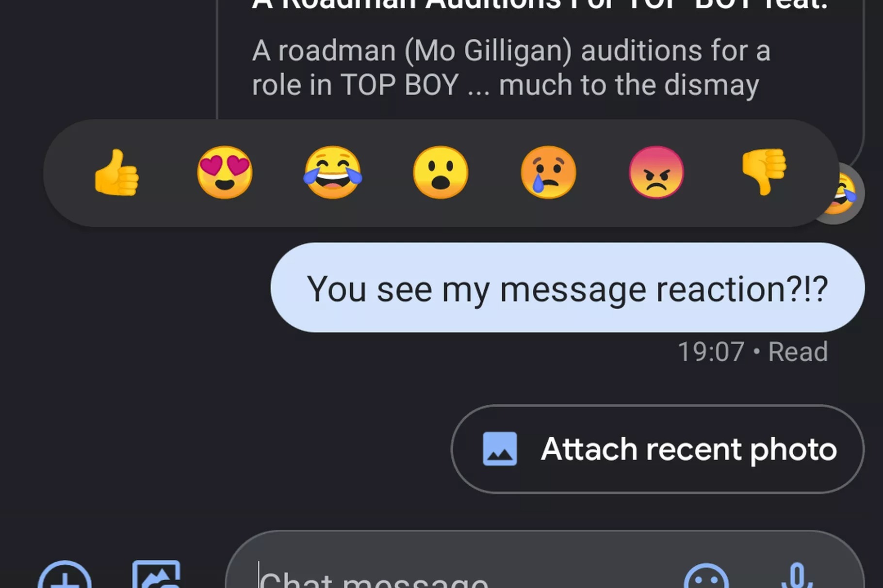 Pour utiliser un emoji de réaction, il suffit de toucher et de maintenir le message auquel vous voulez réagir et une courte liste d’emojis animés s’affichera dans laquelle vous pourrez choisir votre préféré. Cependant, vous ne pourrez utiliser les réactions d’emoji que si le chat RCS est activé.