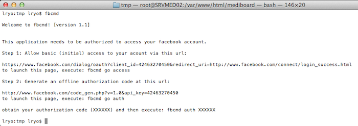 Comme vous pouvez le lire, vous devez autoriser fbcmd à de multiples niveaux. Fondamentalement, lancez BlogNT$ fbcmd go access, et donnez l’autorisation de base. Ensuite, tapez : BlogNT$ fbcmd go auth. Vous devez générer un code que vous allez copier-coller dans la commande : BlogNT$ fbcmd auth [code][/code].