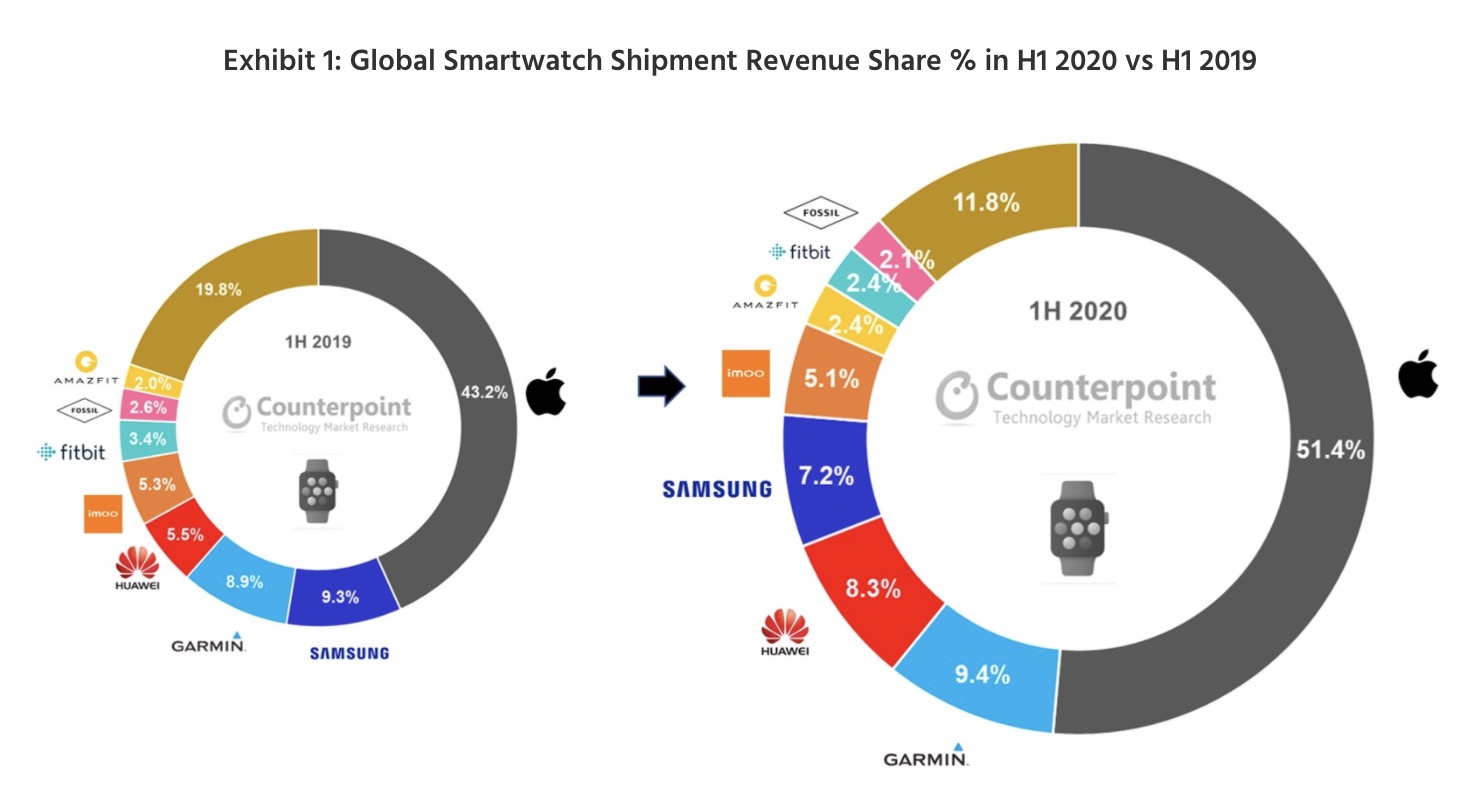 Apple continue de dominer le marché mondial des smartwatches, tant en termes de volume que de valeur. C’est ce que révèle un nouveau rapport de la société de recherche et d’analyse Counterpoint, qui indique que les ventes de montres Apple Watch ont augmenté de 22 % au niveau mondial au cours des six premiers mois de cette année, en grande partie grâce à la forte demande pour les modèles de la 5e génération. L’Europe et l’Amérique du Nord ont été les marchés qui ont connu la plus forte croissance pour Apple au premier semestre 2020, selon le rapport.