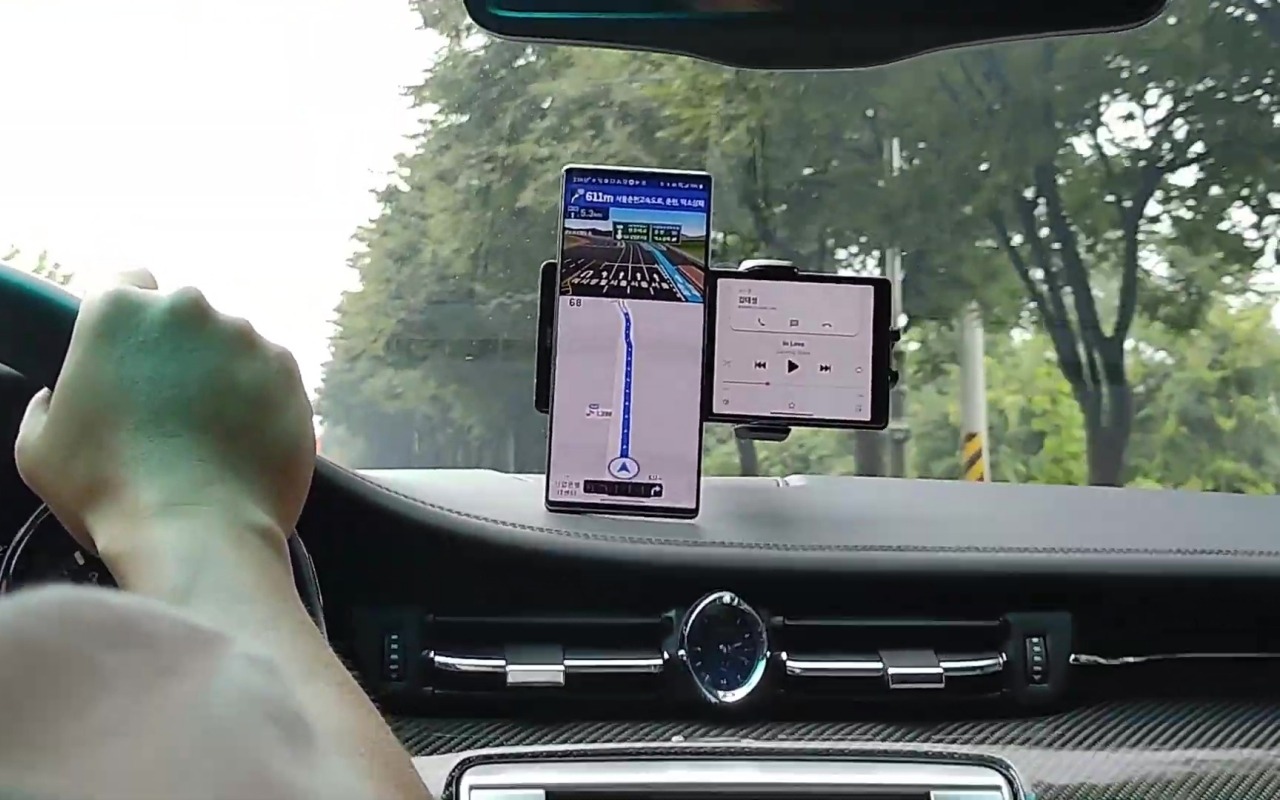 Grâce à Android Authority, nous avons pu voir pour la première fois le LG Wing en action. Cela me ramène directement au début des années 2010, lorsque les téléphones à clapet ou rotatifs étaient à la mode. La courte vidéo montre le LG Wing posé au-dessus du tableau de bord d’une voiture. Nous voyons également l’écran principal de 6,8 pouces (vertical) qui montre la carte et l’écran de 4 pouces (horizontal) qui joue de la musique.