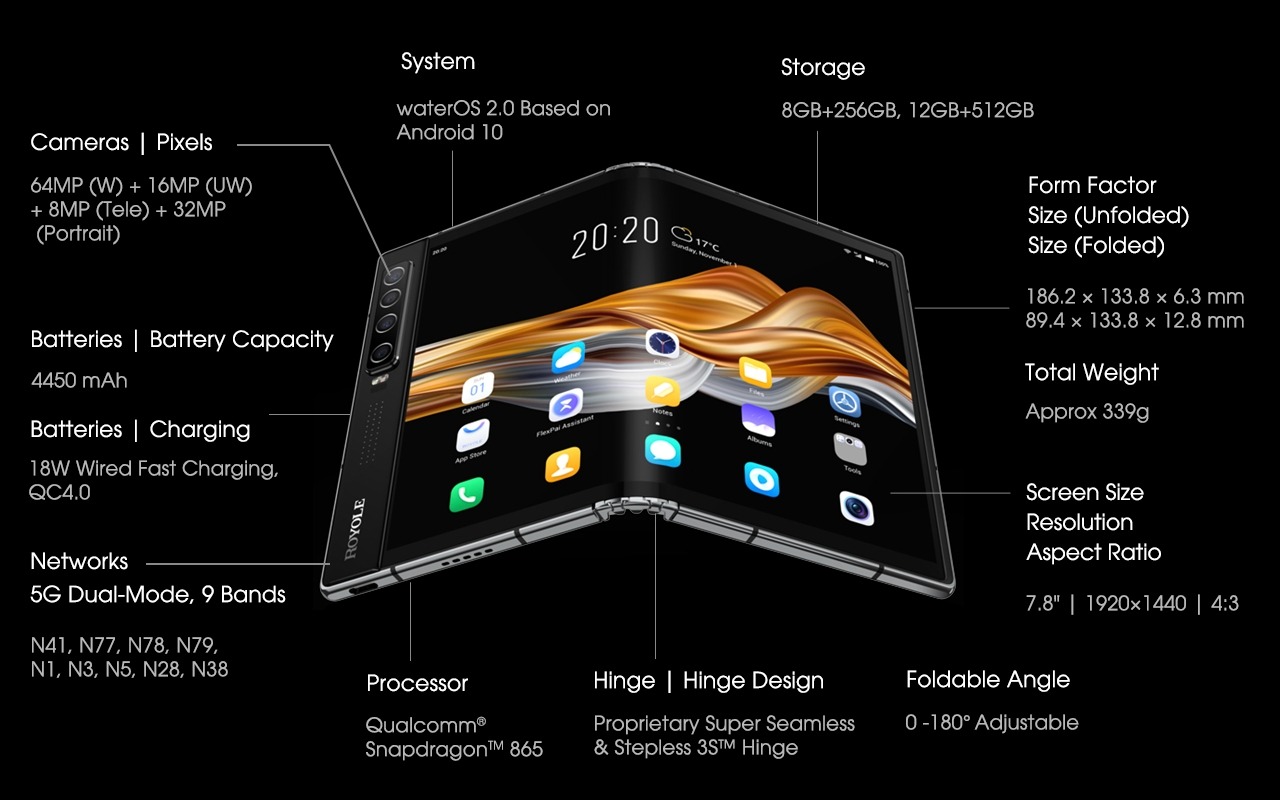 Le Royole FlexPai 2 est livré avec une surcouche d’Android 10 (waterOS 2.0) et prend en charge les réseaux 5G en Chine et en Europe.