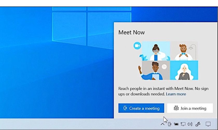 À partir de cette mise à jour, l’icône « Meet Now » est placée dans la barre d’état système. Il suffit donc de cliquer sur l’icône et de sélectionner l’option « Créer une réunion » pour commencer un nouvel appel. D’autre part, si vous souhaitez participer à une réunion, il existe une option dédiée pour celle-ci aussi. Vous n’avez besoin que du lien de la réunion ou du code et c’est à peu près tout, car aucune signature n’est requise.