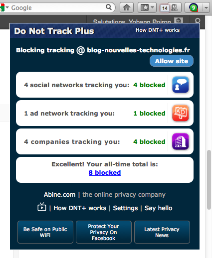 Une fois installé, lorsque vous visitez un site Web, en fonction du code qu’il embarque, ce dernier indiquera à votre navigateur de lui fournir les informations dont il a besoin – à propos de ce que vous faites et qui vous êtes. “Do Not Track Plus” va interrompre cette communication entre le site et évite que votre navigateur pose trop de questions. Ainsi, il vous évite d’être suivis !