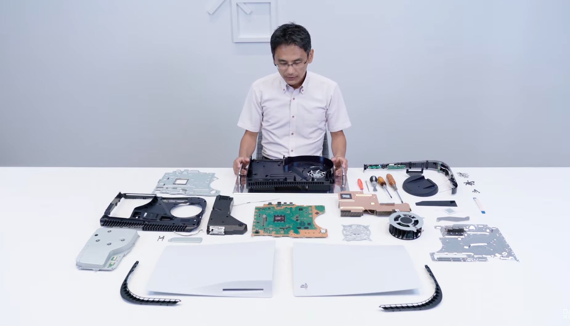 Après un rapide aperçu de l’extérieur, il est temps de démonter la console. Sony commence par retirer le support, puis les panneaux blancs amovibles par l’utilisateur. C’est là que nous voyons les capteurs de poussière de la PS5, qui tentent de capturer la poussière apportée par le grand ventilateur de 120 mm de la console. Plutôt que de démonter toute la console pour nettoyer la poussière qu’elle accumule au fil du temps, Sony explique que les utilisateurs n’ont qu’à passer l’aspirateur dans deux trous sur le côté de la console pour enlever la poussière accumulée dans le collecteur.