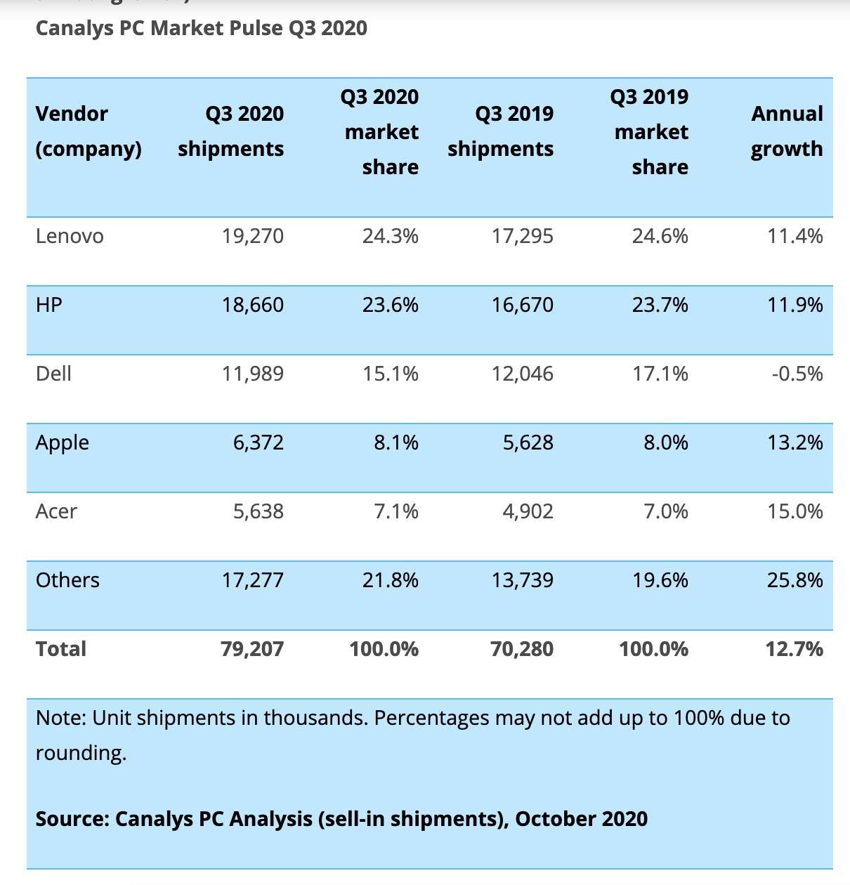 Voici la répartition des principaux fournisseurs de PC au troisième trimestre 2020 selon Canalys :
