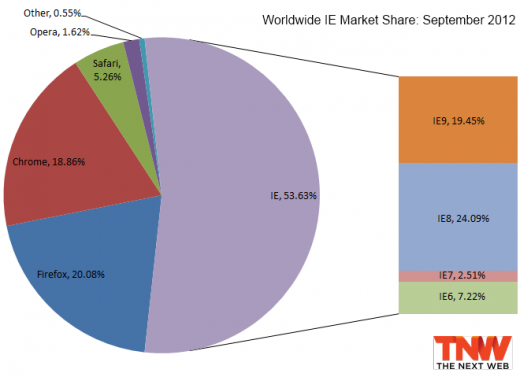 Avec 53,63%, Internet Explorer semble fournir des indications de résistance, et dispose encore d’un peu plus de la moitié des parts de marché. Avec Windows 8 et IE10 qui vont être publié le mois prochain, nous allons voir si le navigateur peut maintenir la domination…