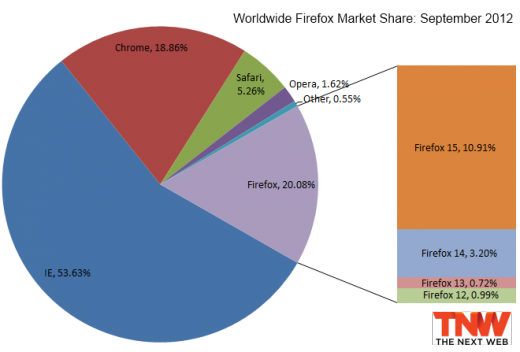 Avec 20,08%, Firefox est encore en dessous de son précédent pic, mais semble refuser perdre sa place sur le marché. Il semble que Firefox 15 n’a pas réussi à aider dans l’ensemble Mozilla à regagner des parts de marché, mais il n’en perd pas non plus.