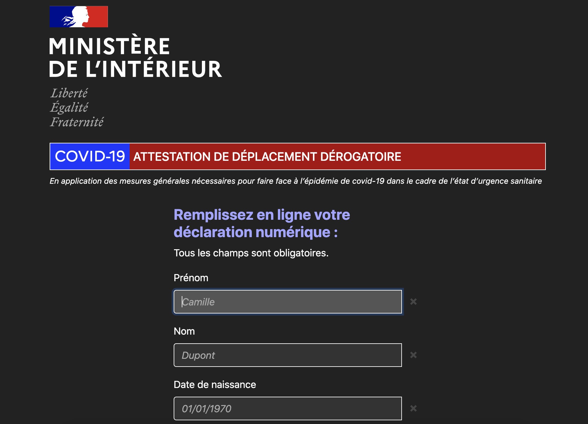Par ailleurs, le site du ministère affirme qu’aucune donnée personnelle n’est collectée durant la génération d’une attestation numérique. En effet, il suffit de saisir les informations sur un formulaire et le document est généré localement. Aucune information n’est transmise aux serveurs du ministère de l’Intérieur.