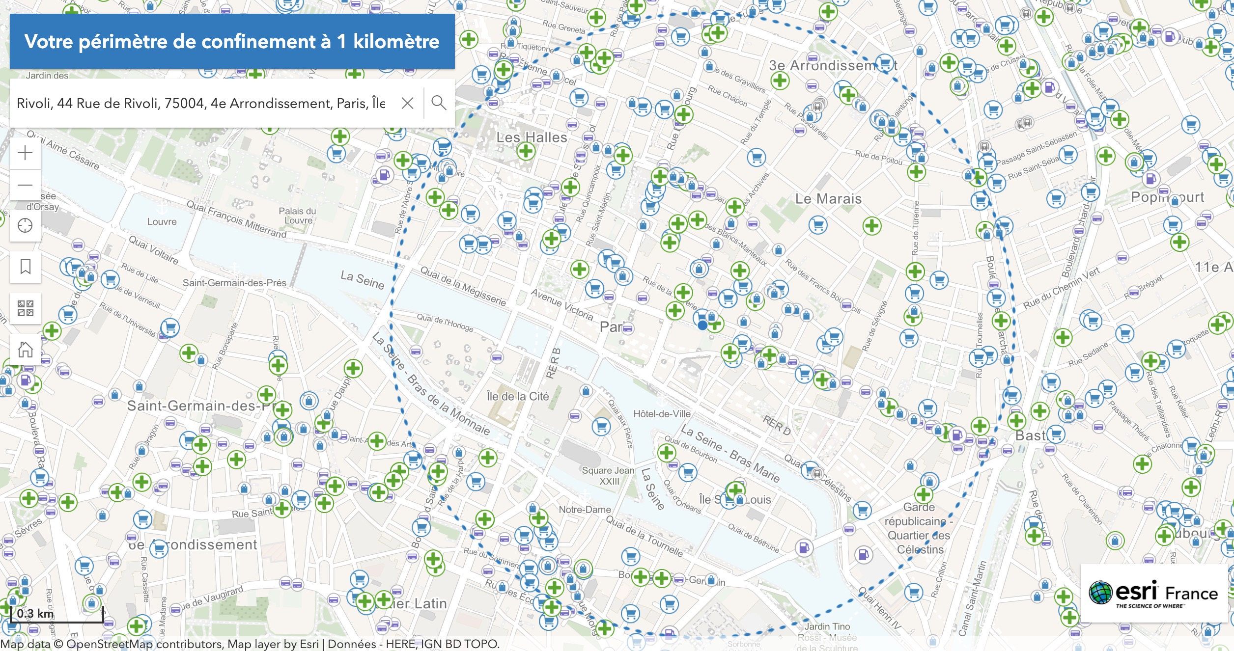 - Dès lors, un cercle bleu en pointillé délimitera votre périmètre de 1 kilomètre