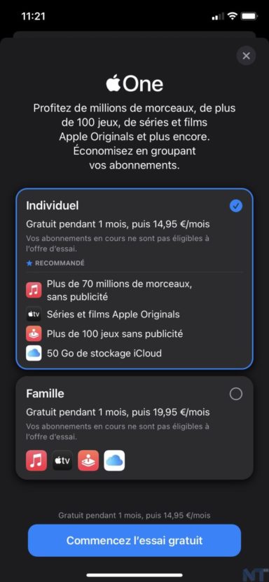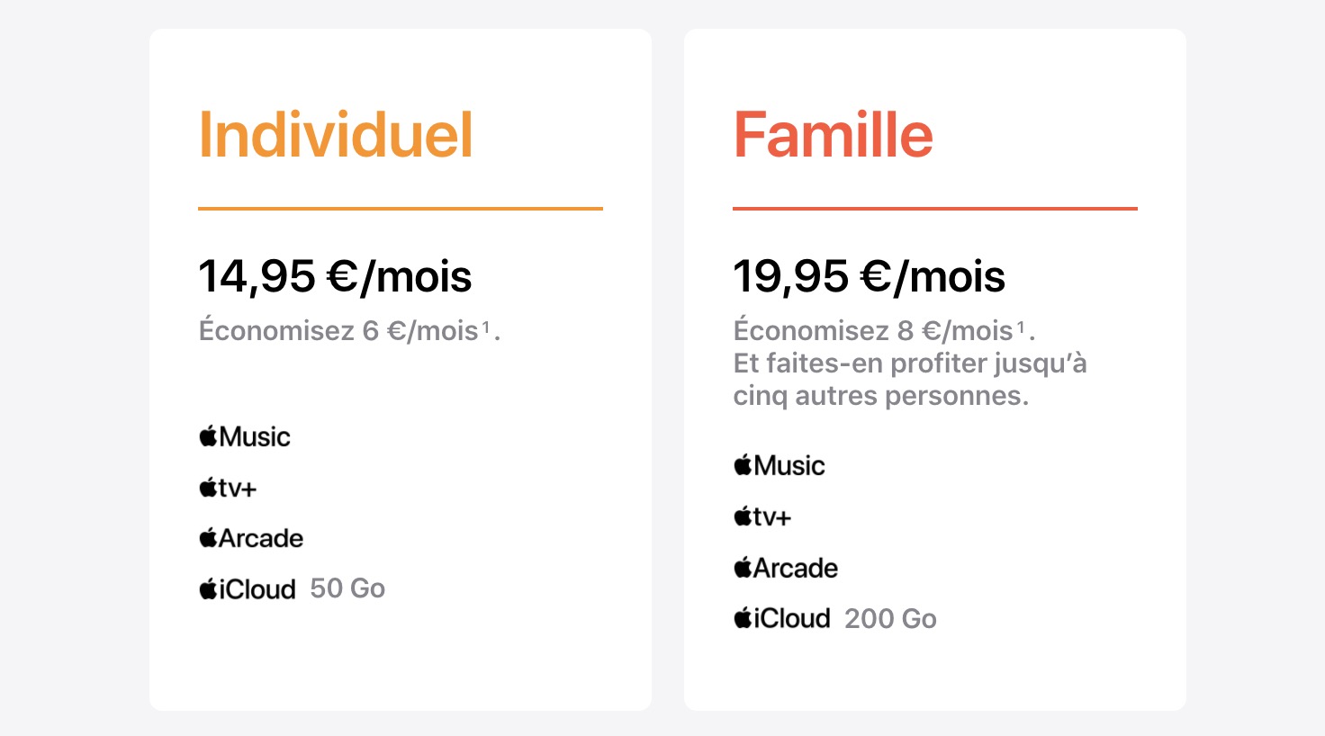 - Individuel (14,95 €/mois) : Apple Music, Apple TV+, Apple Arcade et 50 Go de stockage iCloud