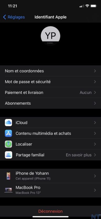 - Cliquez sur votre Apple ID en haut du menu principal des réglages. C’est la boîte avec votre nom dessus
