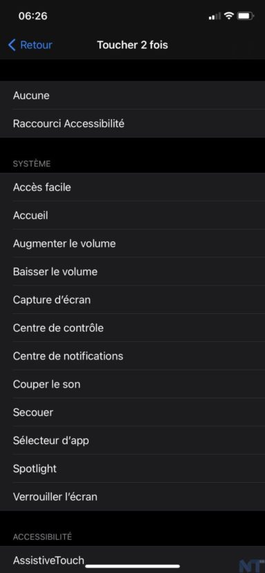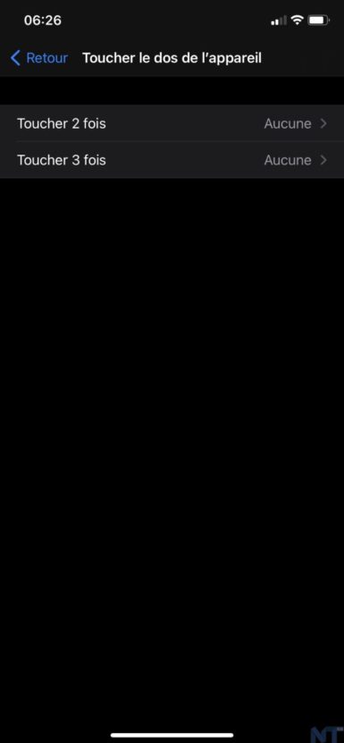 - En bas de la liste, vous devriez retrouver « Toucher le dos de l’appareil ». Cliquez dessus et choisissez votre action : Toucher 2 fois ou Toucher 3 fois