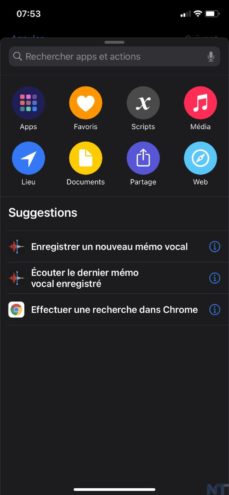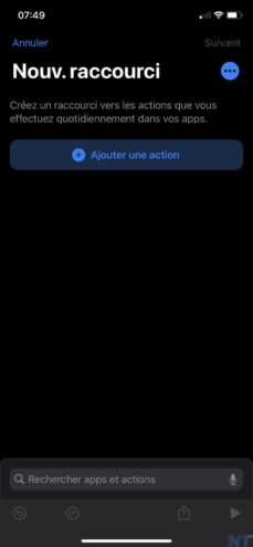 - Dans l’application Raccourcis, créer un nouveau raccourci en cliquant sur le sigle « + » en haut à droite