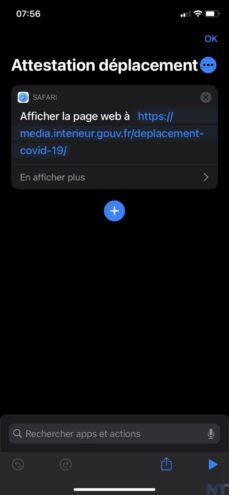 Vous l’aurez compris, en liant ce bouton virtuel à l’application Raccourcis vous pouvez faire de nombreuses choses comme… se rendre sur le site du ministère de l’Intérieur pour générer votre attestation de déplacement dérogatoire. Il suffit que tous les champs se remplissent automatiquement à l’aide de Safari, et vous devrez uniquement choisir le motif et l’heure de déplacement. Je vous montre ?