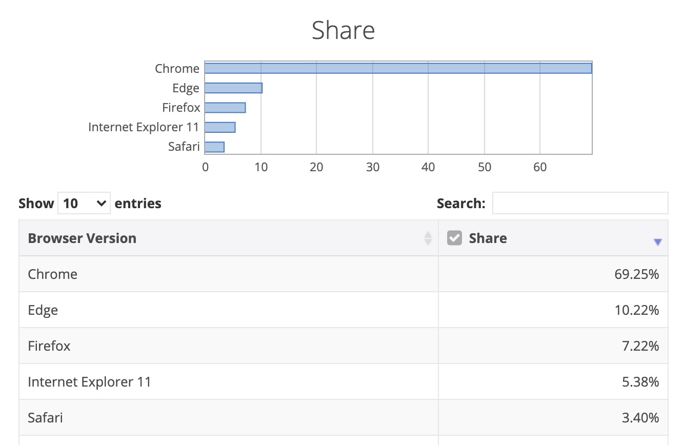 Le navigateur situé juste en dessous de Edge est Firefox avec 7,22 % du marché, Internet Explorer est quatrième avec 5,57 % du marché, et Safari est cinquième avec 3,40 % du marché. Chrome a un peu d’avance sur certains autres navigateurs, car Google encourage les utilisateurs de son moteur de recherche extrêmement populaire à utiliser Chrome et les appareils Android sont livrés avec Chrome préinstallé.