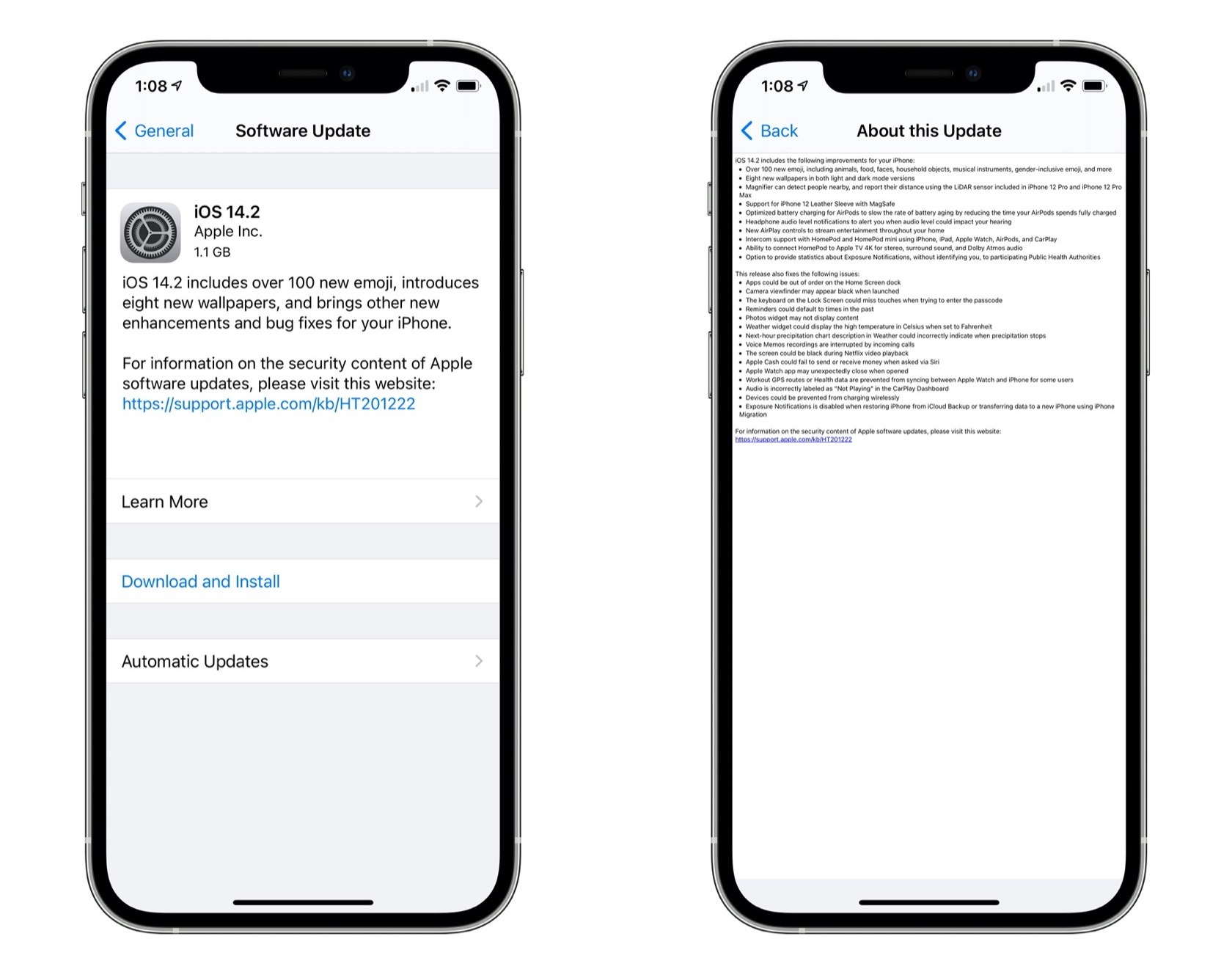Pour les AirPods, il y a maintenant un chargement optimisé de la batterie qui, selon Apple, devrait ralentir le rythme de vieillissement de la batterie des écouteurs sans fil. iOS 14.2 comprend également un certain nombre de corrections, comme toujours, comme la correction de l’étrange bug du « viseur d’appareil photo noir » que certains utilisateurs ont rencontré, et des touches de clavier manquantes sur l’écran de verrouillage lorsque vous essayez de taper votre code. Il existe également des correctifs pour les écrans noirs pendant la lecture de Netflix, pour Apple Cash qui n’envoie ou ne reçoit pas d’argent lorsqu’il est utilisé avec les commandes vocales Siri, et pour les problèmes d’itinéraires GPS dus à des séances d’entraînement qui ne se synchronisent pas entre l’Apple Watch équipé d’un GPS et l’iPhone.