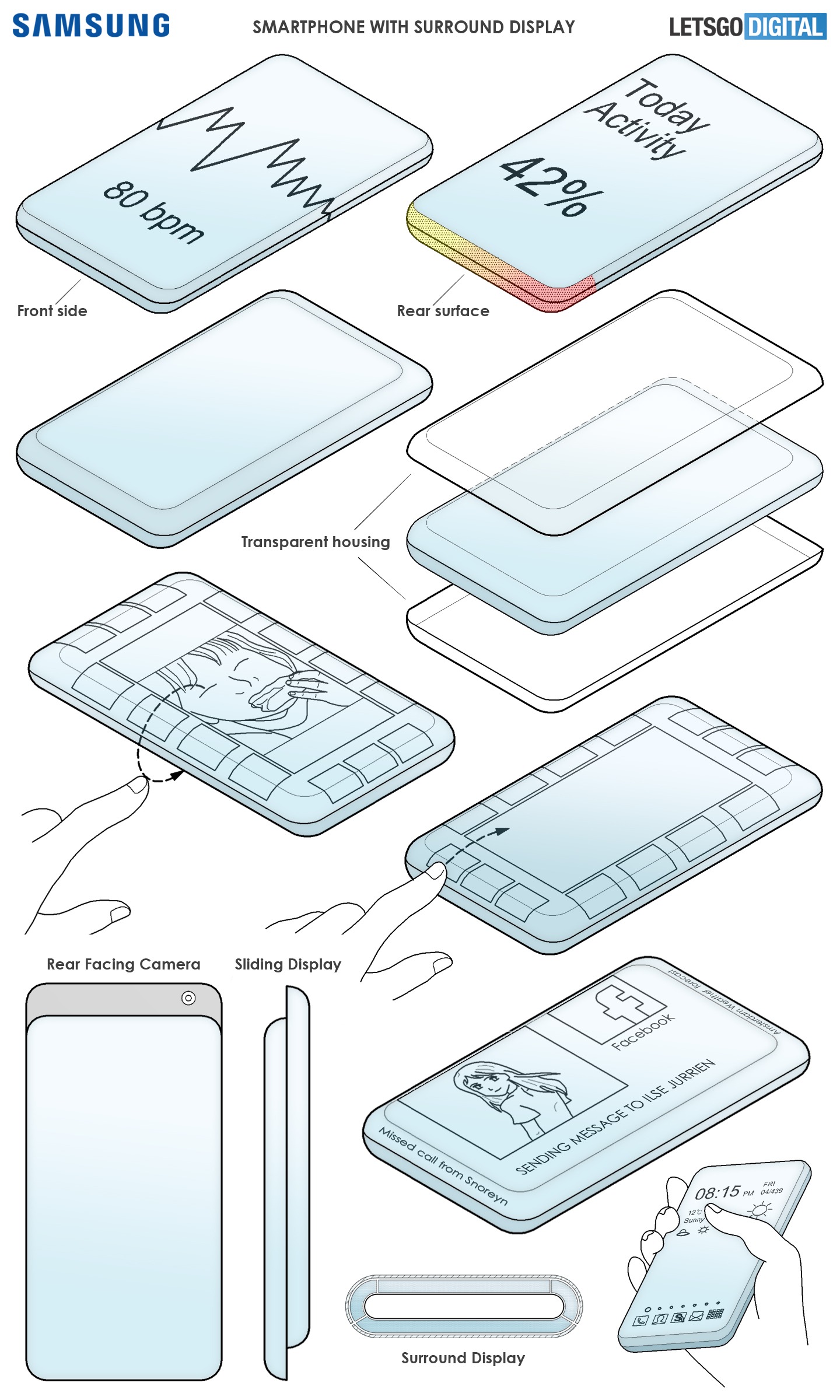 L’appareil n’aura aucun bord et sera recouvert simplement d’un écran. De plus, Samsung déclare qu’elle utilisera un boîtier transparent pour l’appareil. L’entreprise peut utiliser des matériaux acryliques ou polymères transparents qui peuvent transmettre la lumière pour fabriquer ce boîtier spécial. Ainsi, conformément au brevet, cela peut ouvrir de nombreuses possibilités pour l’appareil. Par exemple, l’appareil pourrait s’adapter à un environnement (un peu comme un caméléon) en combinant le boîtier transparent et le réseau de capteurs externes de la caméra.